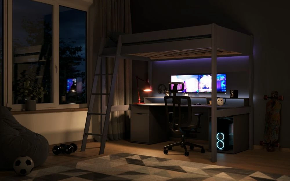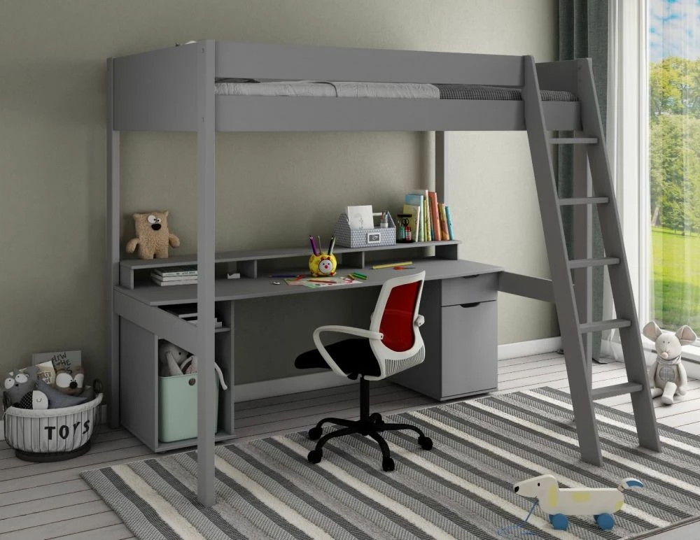 The Astral Small Double Gaming High Sleeper Bed in Grey is part of the sustainable living collection by Children’s Bed Shop. A spacious under bed area featuring a built-in gaming desk makes for the perfect gaming environment. A roomy small double continental bed along with plentiful storage space and a built-in MDF desk, makes this bed perfect for creating the sense of more space in those smaller bedrooms.