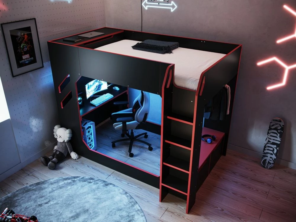 Do you have a child or teen that loves playing online games? Why not introduce them to the Flair Recoil Shuttle High Sleeper Bed in black and red? The sleek and stylish colour scheme is sure to be a smash hit for any serious gamer as the whole frame has been intricately designed to fit the needs by including a desk area that can be placed lower for a more laid-back gaming experience, or can be placed at its normal height for more intense gaming sessions!