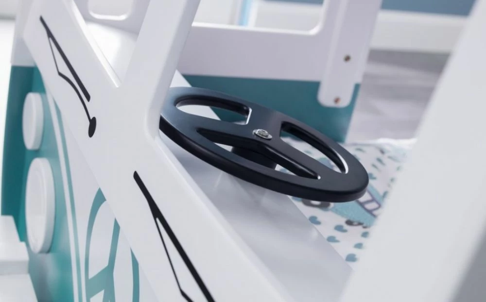 The Campervan Bunk Bed is a fantastic childrens themed bunk bed from the reputable manufacturer, Julian Bowen. The Campervan Bunk Bed is the perfect fun iconic campervan design which is transformed into a fun sleeping solution for any child’s bedroom. Beautifully crafted, sturdy bed will make your child feel secure at bedtimes, as well as providing a fun space for them to use during the day. Featuring a surfboard style ladder, steering wheel and very accurate detailing to give a realisitic look. This Campervan Bunk Bed is guaranteed to introduce instant fun and colour into your childrens bedroom.