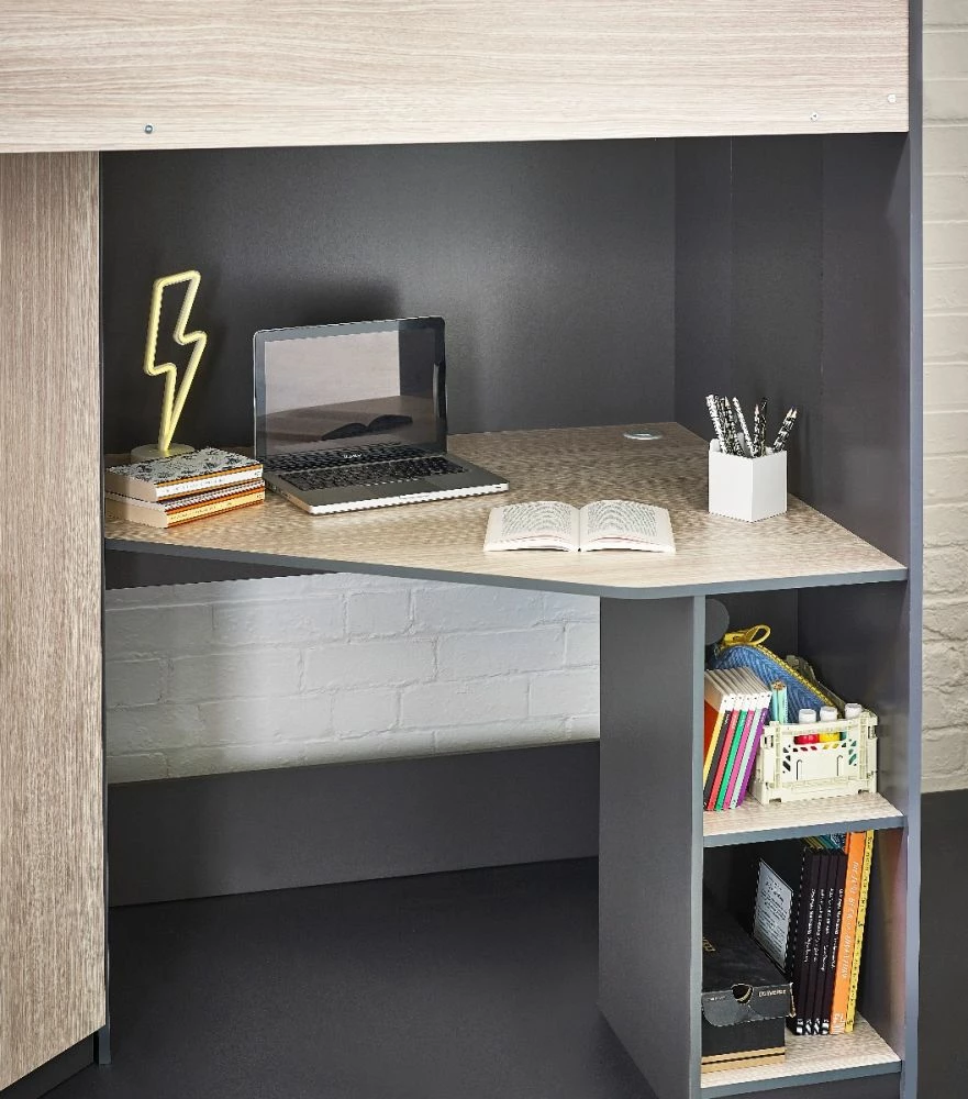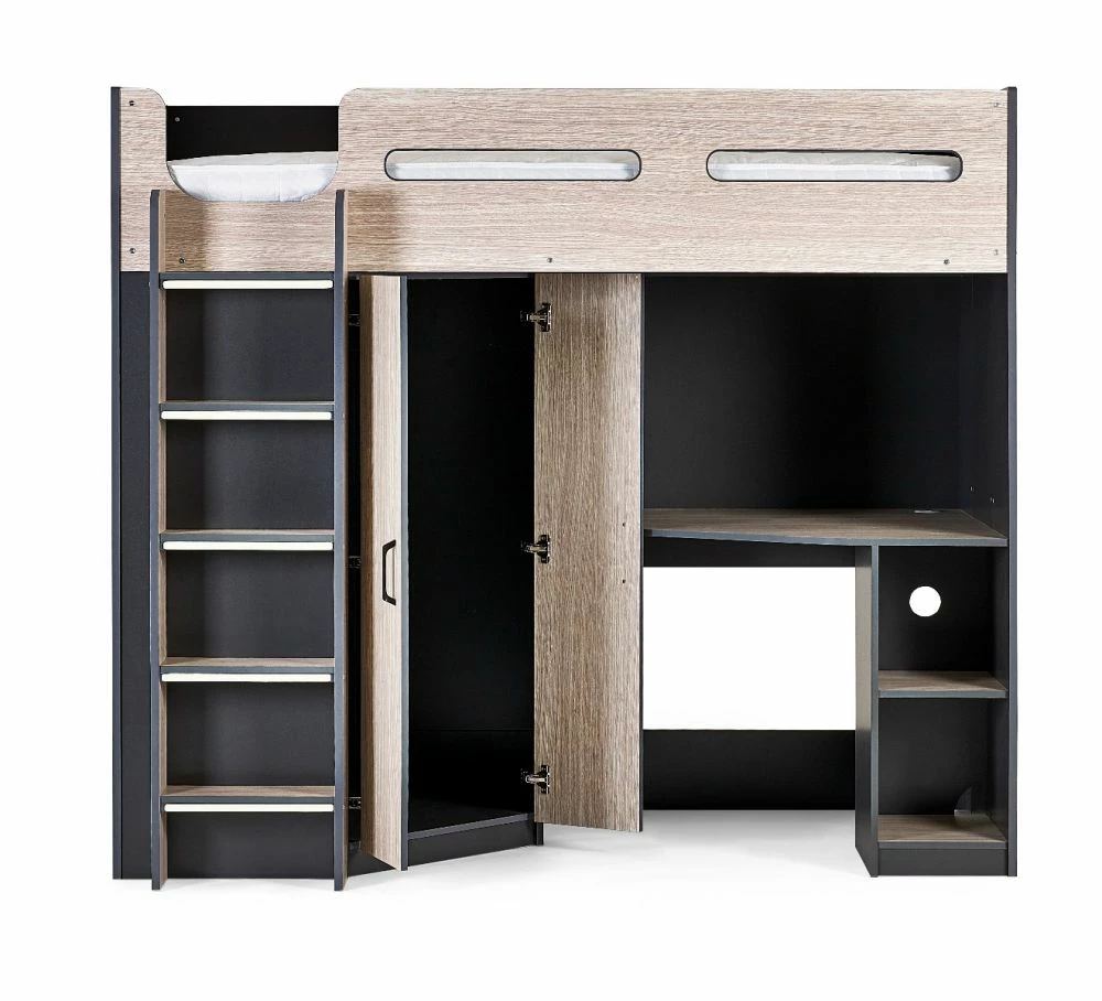 The Julian Bowen Hercules High Sleeper Bed in Woodgrain & Anthracite is a fantastic new addition to our High Sleeper collection! Designed with perfect functionality, the Hercules High Sleeper in Woodgrain & Anthracite is the ultimate bed for your child. The angled wardrobe provides ample space for clothing, whilst the built-in shelving is great for all of their files, folders, trainers, or games to stay organised. With glow-in-the-dark steps, and colourways of white and anthracite also available, there is an option for any interior style.