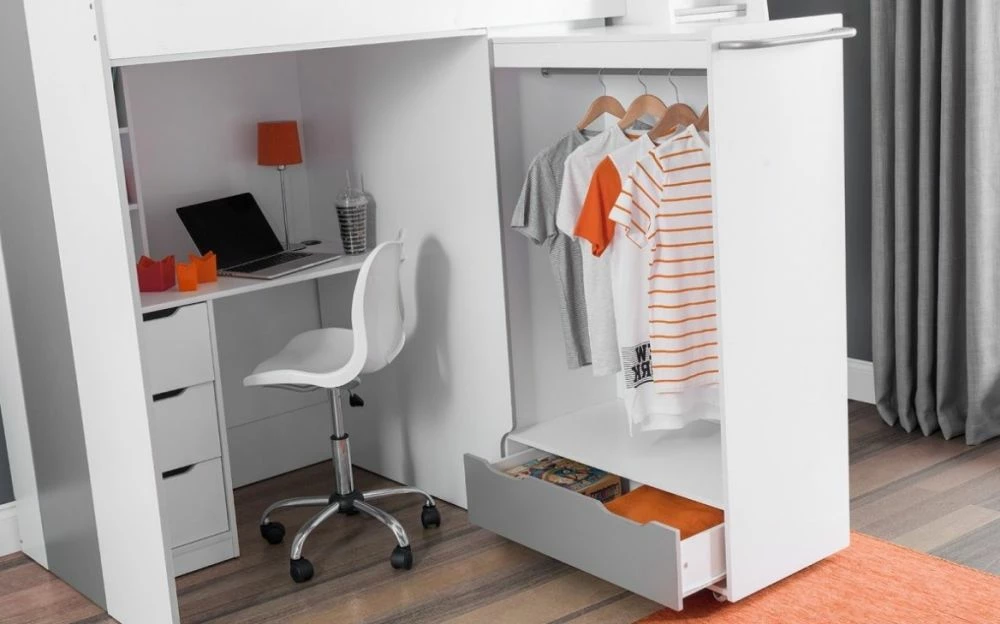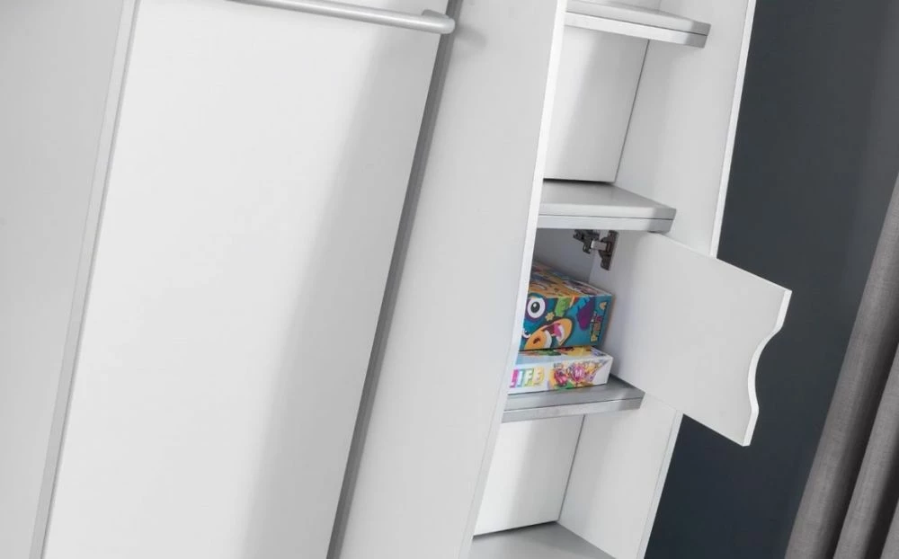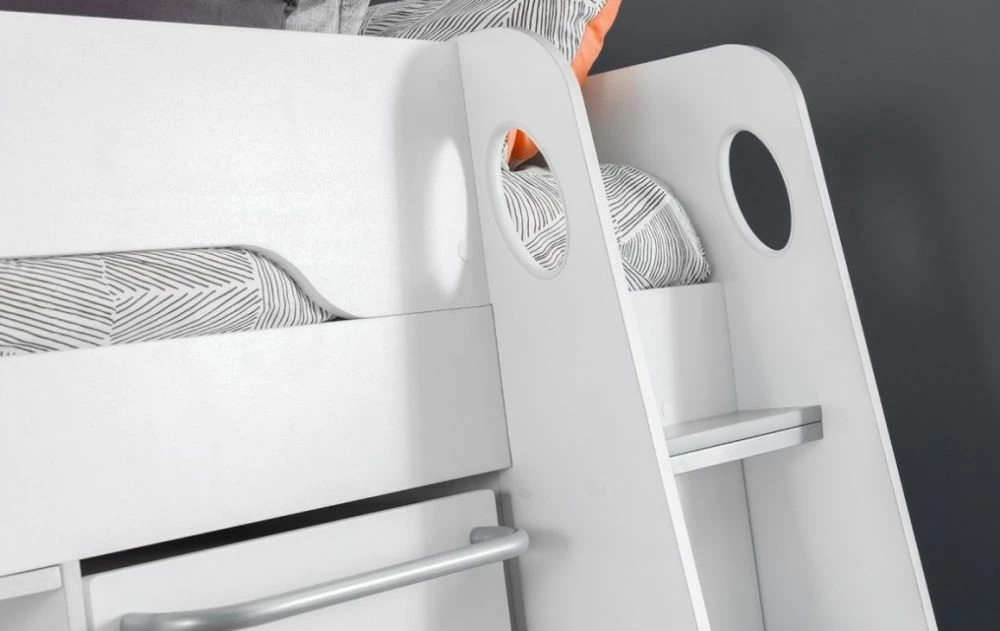 The Julian Bowen Pegasus High Sleeper Bed is the ultimate in functional bedroom furniture for kids and teenagers. The Julian Bowen Pegasus High Sleeper is finished in timeless matt white with silver-grey colour accents. The Pegasus High Sleeper loft bed features an incredibly practical pull-out wardrobe with integral storage drawer, which really maximises the space available within its compact footprint. The robust desk includes further storage drawers and cable holes and there is ample headroom for kids to work in comfort. The robust ladder includes further hidden handy storage cupboards at every step.