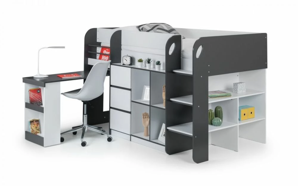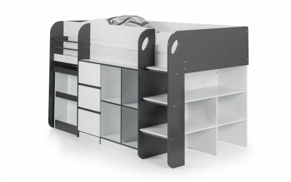 The Julian Bowen Saturn White & Grey Mid Sleeper Bed in Surf White offers a clean and compact space saving solution and is suitable in a boys or girls bedroom. The Saturn Mid Sleeper features a bookcase, 3 drawer chest and a cube bookcase to allow for additional space to store books and toys. The Saturn Mid Sleeper comes in a trendy charcoal grey and white finish and is perfect for a wide range of Children’s bedroom decor. The Saturn Mid Sleeper is crafted from sturdy particleboard and is provided with a wooden slatted base. The Saturn Mid Sleeper bed also comes with a 12 month manufacturers warranty, as standard.
