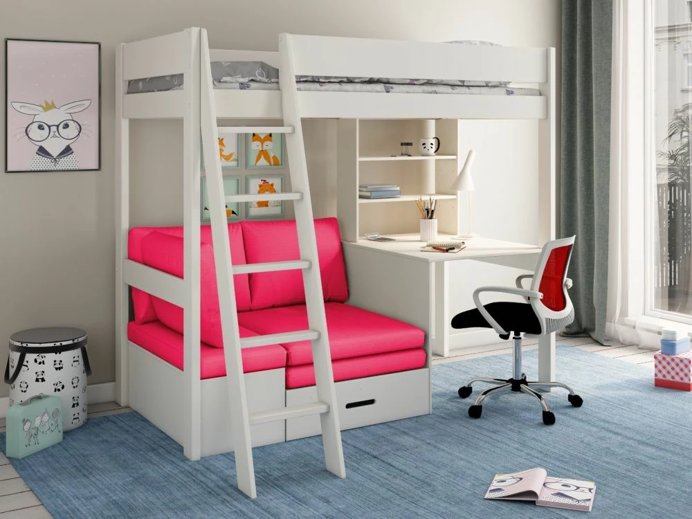 The Kids Avenue Estella White High Sleeper Bed with Pink Futon is a new addition to our already popular Estella range and features a large pink futon that makes this bed stand out in any bedroom! The design features a ladder that can be fitted either to the left or right, depending on the layout of your bedroom and takes a standard 3ft UK sized single mattress. The Estella White Highsleeper comes with a built in desk and shelving unit, as well as a pull out bed, storage box and pink futon. There is also a hidden storage box which can be located underneath the corner sofa which will allow you to store away books and bedding. The Kids Avenue White Estella High Sleeper is delivered flat pack for self assembly with easy to follow instructions or you can look to purchase our assembly service for an additional charge. The Kids Avenue Estella High Sleeper also comes with a 2 year manufacturers warranty, for that extra piece of mind.