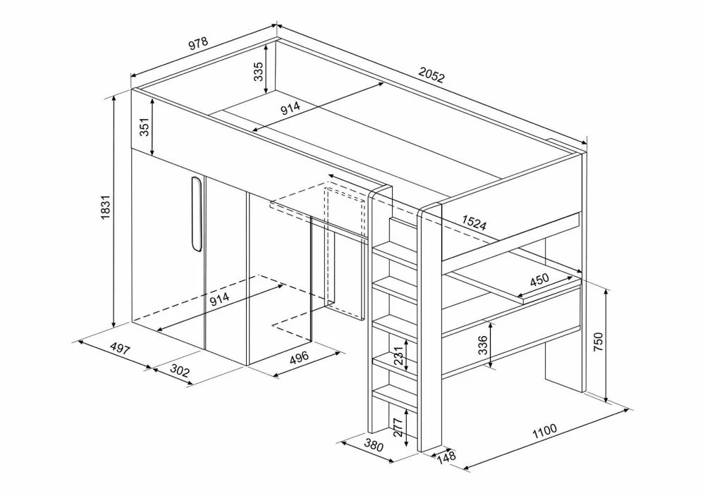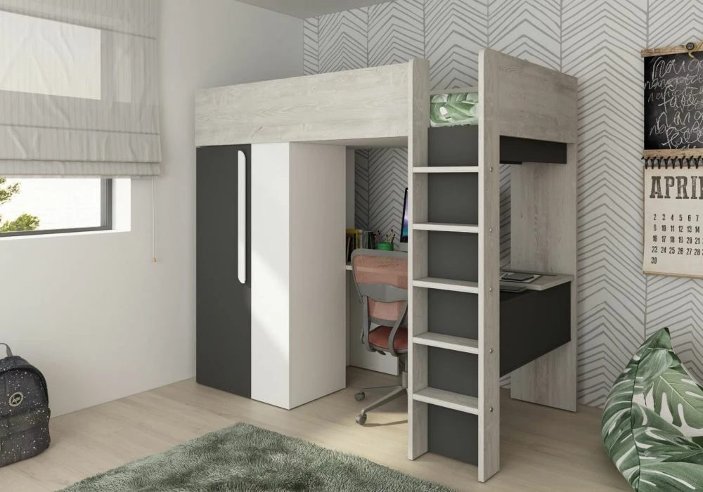 The Kids Avenue Trasman Mont Blanc High Sleeper is a perfect addition to any childs bedroom and consists of a solid high bed, a desk great for study or a dressing table a built in wardrobe and shelving to keep clothes neatly tidied away. The Kids Avenue Trasman Mont Blanc is finished in grey oak, dark charcoal and white perfectly neutral to compliment any room. This bed frame fits a European single sized mattress (90cm x 200cm), which we supply as an optional extra from the dropdown menu provided.