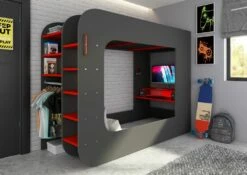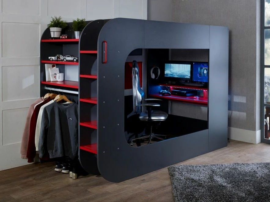 The POD 1 Gaming Highl Sleeper has many fabulous features. The POD area can be accessed from either side and has a built in desk with a raised monitor shelf, cable tidy and a spacious desk area illuminated with an LED light strip with colour options to suit your mood. To the end of the bed is an open wardrobe with a wide hanging rail and three generous shelves for storage. The ladder has wide treads making accessing the small double sized sleepzone safe and easy. With its unique design and stunning grey and red finish this bed will look awesome in a game enthusiasts bedroom!