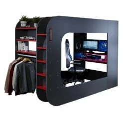 The POD 2 Gaming High Sleeper has many fabulous features. The POD area can be accessed from either side and has a built in desk with a raised monitor shelf, cable tidy and a spacious desk area illuminated with an LED light strip with colour options to suit your mood. To the end of the bed is an open wardrobe with a wide hanging rail and three generous shelves for storage. The ladder has wide treads making accessing the small double sized sleepzone safe and easy. With its unique design and stunning grey and red finish this bed will look awesome in a game enthusiasts bedroom! The POD 2 Gaming High Sleeper comes with the addition of a grey sofa bed, which provides extra comfort to that addictive gamer!