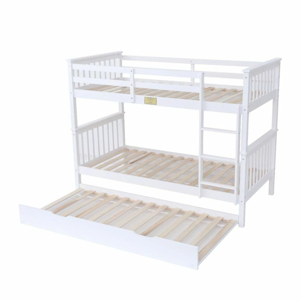 Simply designed in a sturdy, almost shaker styled design, the Noah White Bunk Bed with Underbed Trundle is the ultimate in practical sleep systems. Comprised of 2 beautifully shaped single beds with a stunning slatted head and footboard, these solid beds can be combined into bunks but also be split into 2 separate standard single beds should you require.
