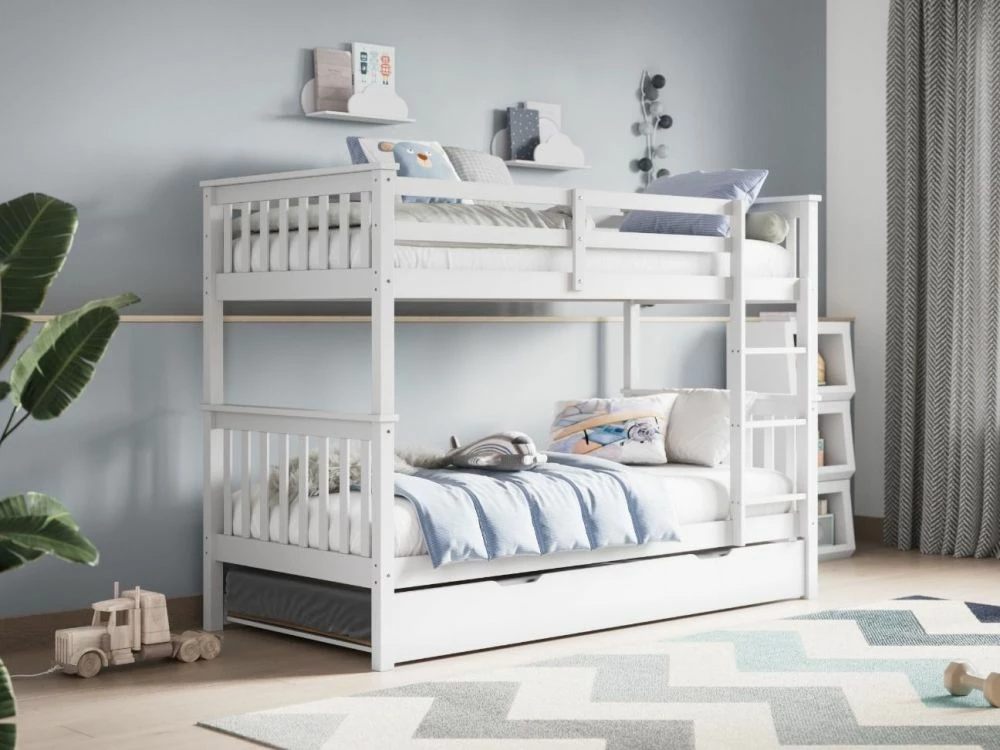 Finished in a clean white paint, the Noah Bunk Bed with Trundle is ideal for providing all the sleeping space you need for friends and family or even just sleepovers.