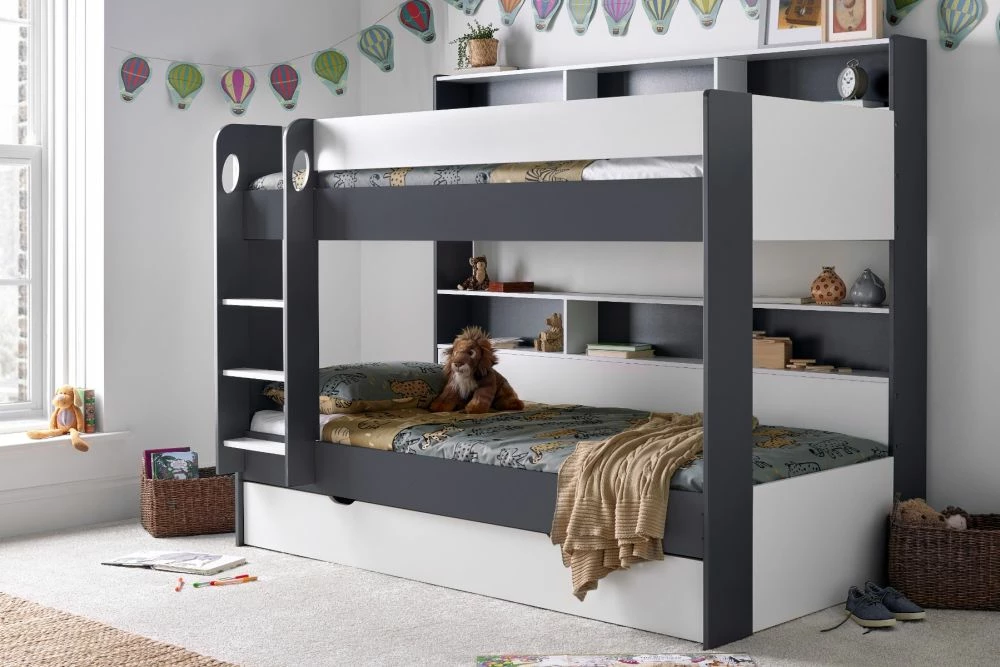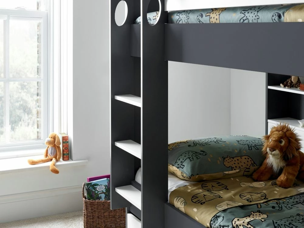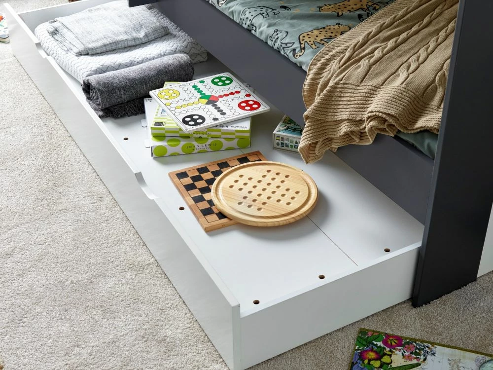 Both the top and bottom bunk on the Oliver White & Grey Bunk Bed have shelves that your child can use to store away books or display figurines. Each shelf has dividers, allowing your child to make themed sections or add organisation. Alongside this, the top of the shelves have a raised lip that helps to prevent smaller items from falling down the back! Another benefit to the Oliver Bunk Bed is the pull-out drawer that allows them put away clothes, extra bedding or even schoolwork!