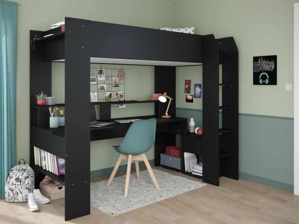 The Parisot Online Gaming High Sleeper from the fantastic manufacturer Parisot offers a sleeping platform, desk and elevated monitor shelf. The Parisot Online Gaming High Sleeper is finished in black creating a modern look to any room. This High Sleeper has the perfect setup for gamers and is solidly constructed meaning it is suitable for older children too! There is lots of storage shelves, even behind the ladder is a drawer with a carbon finish handle. The Parisot Online Gaming High Sleeper features a 1.84M wide desktop, a handy bedside platform with a double USB socket and a LED lightstrip offering a choice of colours to suit your mood or bedroom, operated via a remote control. This High Sleeper takes a 90cm x 200cm mattress which can be added at the time of ordering. An assembly service is also available on this package and can be added when placing an order.