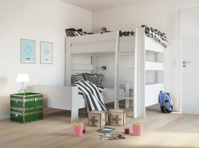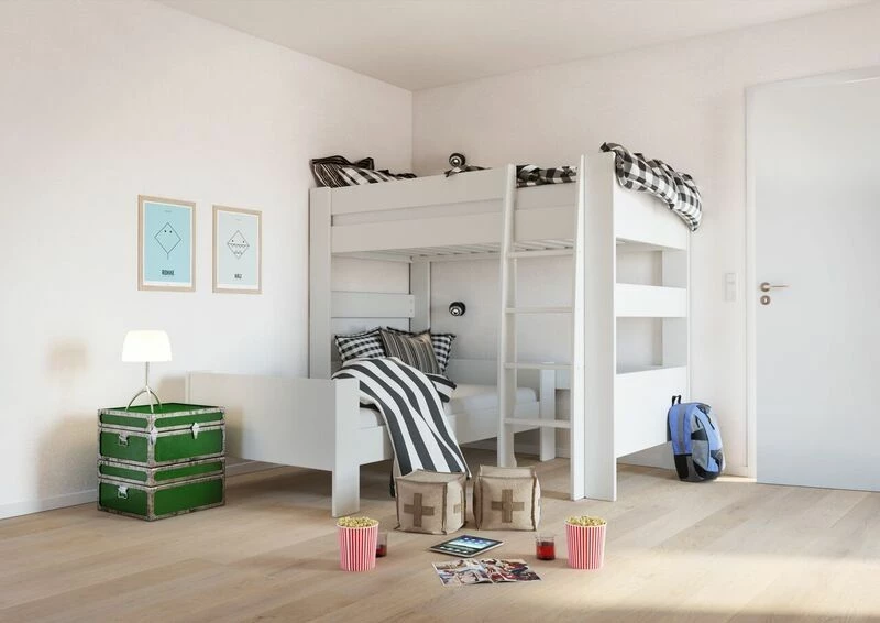 The Steens Memphis UK High Sleeper and Single Bed in Surf White is a fantastic childrens highsleeper loft bed from the manufacturer, Steens. The Steens Memphis UK “L” shaped Highsleeper and Single Bed set-up is a fantastic childrens bed made from sturdy MDF material, with a surf white finish (brilliant white) for a contemporary look. The Steens Memphis UK Highsleeper and Single Bed is designed to accept a UK single sized mattress for the High Sleeper (90cm x 190cm) and a EU single sized mattress (90cm x 200cm) for the Single Bed. This bed frame also has pine wooden slats for a supportive bed base. The Steens Memphis UK Bed has an eye-catching style, featuring curved edges and an integrated ladder for ease when your child climbs up to the top bunk. The ladder can be positioned both sides. Perfect for brightening up any kid’s bedroom, the Steens Memphis UK High Sleeper and Single Bed makes bedtime fun for your children.