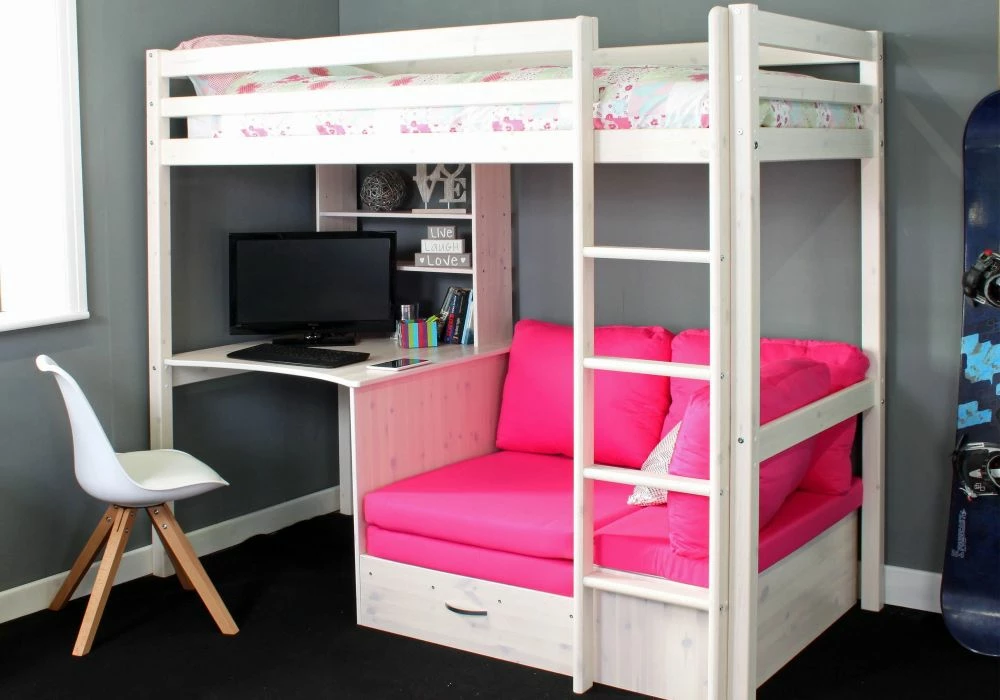 The Thuka Hit 7 High Sleeper Bed is a modern and trendy high sleeper made from solid pine in a whitewash lacquer finish. The Thuka Hit 7 High Sleeper includes a practical desk for study or gaming, shelving for storage, behind the ladder a storage box perfect for bedding and as well as a stylish pull-out chair bed which is great for get-togethers with friends who can sleepover. The Thuka Hit 7 High Sleeper bed is very well constructed with a reversible ladder allowing you to position the bed in the best way to suit your child’s bedroom. The Thuka Hit 7 High Sleeper comes with a sofa/chair bed with a pink cover as standard as well as a 2 year manufacturer’s warranty, as standard.