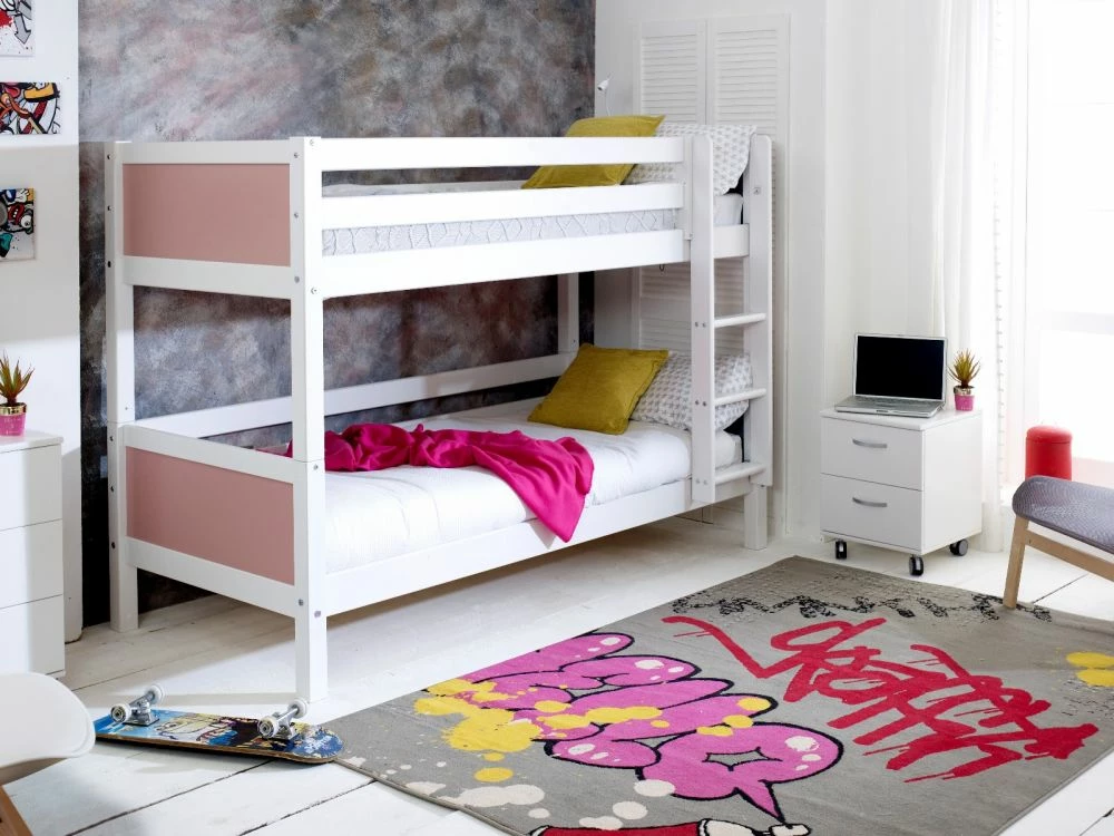 The Thuka Nordic Bunk Bed 1 in White is a brilliant bunk bed, made from solid Scandinavian pine and finished in a smooth white lacquer. The Nordic’s contemporary design is accompanied by great functionality, with a robust ladder that can be assembled on either left or right and the capacity to convert to two single beds or high sleeper at any time in the future. Thuka Nordic Bunk Bed 1 in White comes in plain white, and with a choice of headboard finishes to complement any bedroom décor. Choose from solid white, grey or rose, or a slatted white or tongue/grooved white finish (see images).