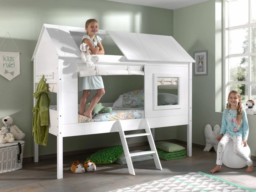 Give your child the bed of their dreams with the Vipack Charlotte Treehouse Bed in White. The Charlotte Treehouse Bed is made from solid pine and MDF and features a ladder, windows to the front and side and a cut out window in the roof. This bed also comes with a deluxe slatted base to for that extra comfort and to allow your mattress to breathe easier. The Charlotte Treehouse Bed is available in white or grey and you can also purchase optional curtains for your house bed to complete the look. This bed is delivered flat pack for self assembly and comes with easy to follow assembly instructions. We also provide a 2 year manufacturers warranty, for that extra piece of mind.